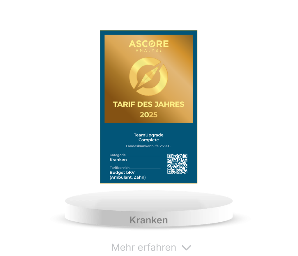 Der Tarif “TeamUpgrade Complete” der Landeskrankenhilfe V.V.a.G. in der Kategorie Kranken erhält von ASCORE Analyse die Auszeichnung Tarif des Jahres.